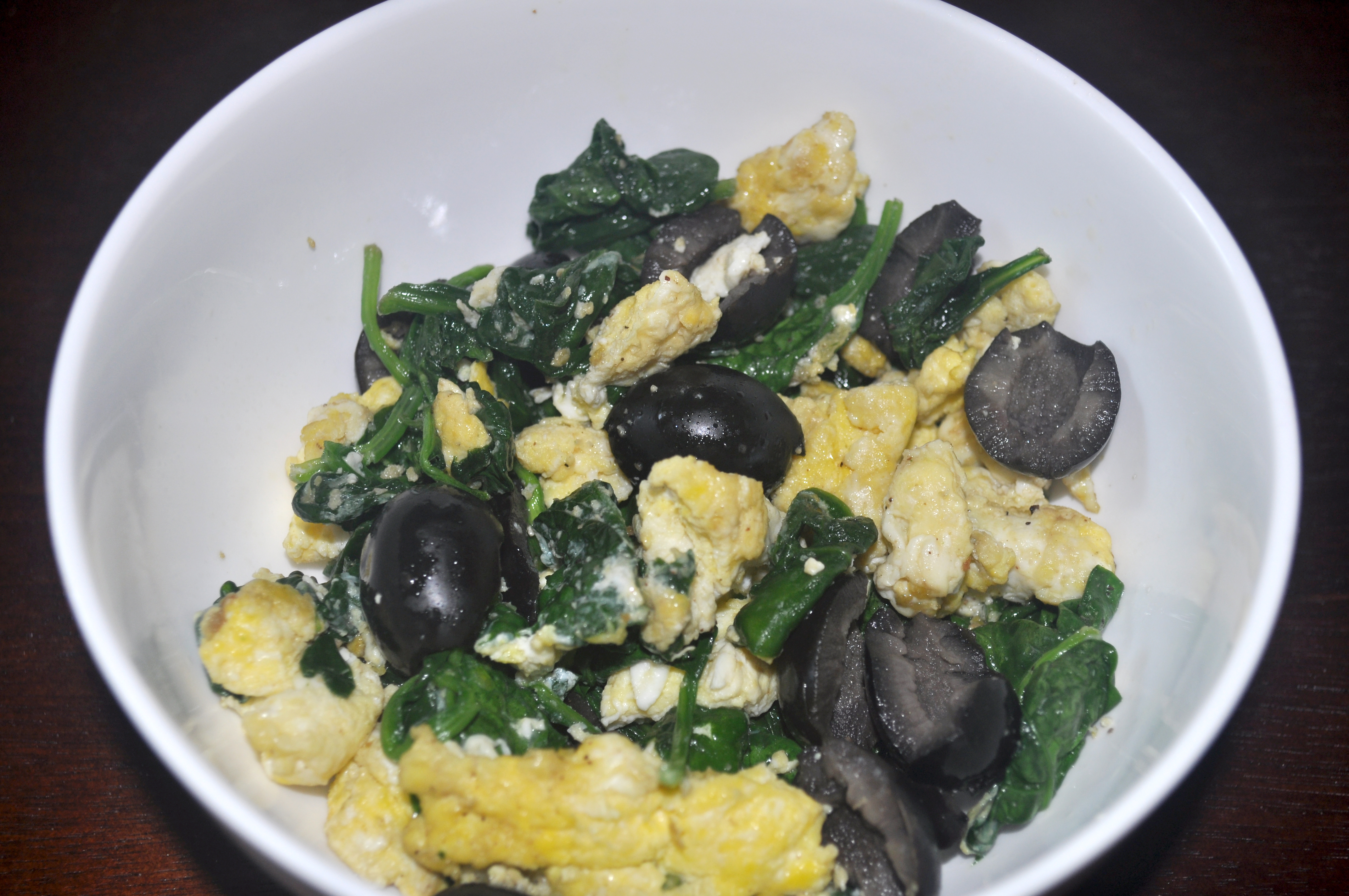 Breakfast: Eggs; spinach sauteed with mushrooms and onion; avocado; grapes; strawberries.