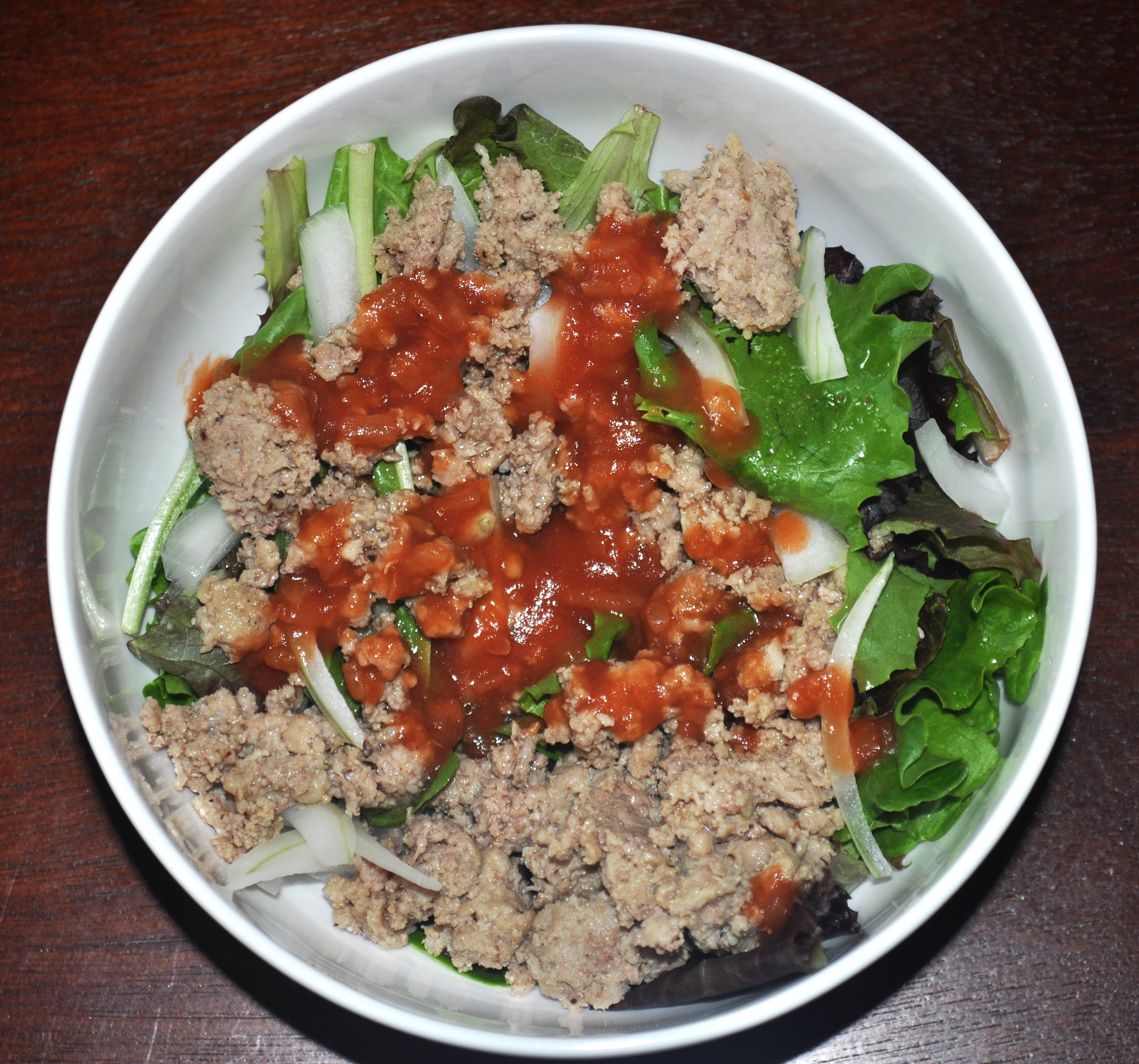 L: Salad- spring mix with ground turkey, onion, and salsa.