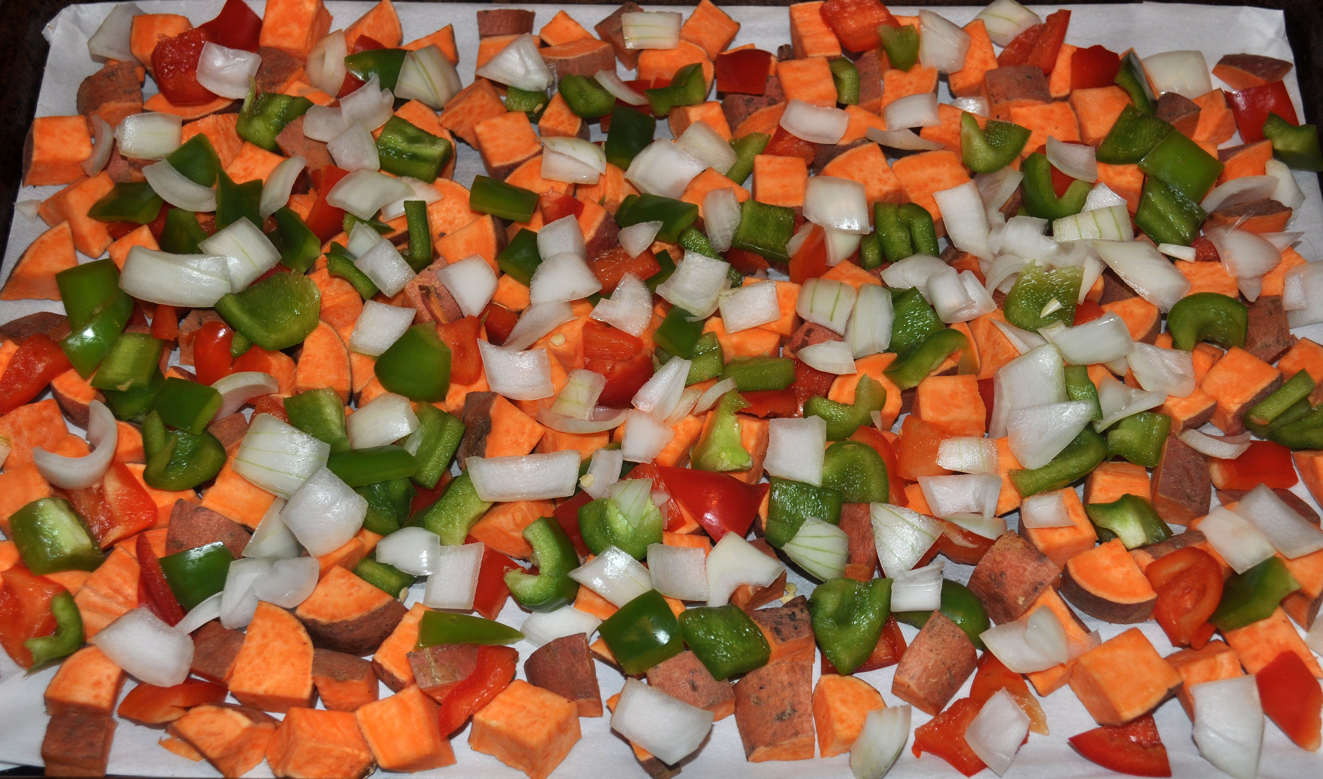 First, you’ll need to preheat the oven to 420. Then cut the sweet potatoes into cubes, and chop the bell peppers and onion. To cut the sweet potatoes, I cut thick, round slices and then quarter those.